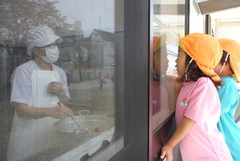 保護者の皆さまへ にじいろブログ 気になる~(*^▽^*) 2020.06.05 「給食のせんせ~い今日のメニューはなんですか?毎日、巧技台に上がって窓越しに会話を楽しんでいるきりんぐみさん。他のクラスの子ども達も順番に巧技台から見ています。 <給食の先生たちの声>梅雨の合間の晴れの日は子ども達が園庭に走りだしてきます。この時間帯の給食室はとても忙しいのですが、うれしそうな笑顔に癒され、励まされながら、毎日給食を作っています。ガラス越しの子ども達の熱い視線に緊張の日々です(笑) . ブログ一覧へ戻る