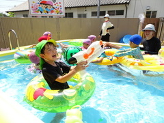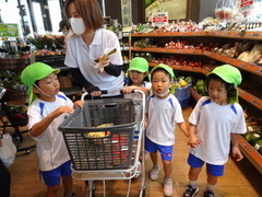 保護者の皆さまへ にじいろブログ お楽しみ保育 2020.08.19 7月18日(土)年長児ぞう組さんが待ちに待ったお楽しみ保育がありました!9時になると昼食で食べるサンドイッチの材料をグループに分かれてクレアにお買い物帰って来てからは、お水がいっぱいに溜まったプールで浮き輪や水鉄砲で思う存分あそびました。その後、ぞう組さんからのリクエストもあり、ビックリ大会をしましたが、「せんせいがなっちょったがやろ~」と全然平気な子もいれば、「こわかったやんか~」と涙目になる子もいました。最後の真実の口で貰った飴玉にはみんなホッとしていましたけど・・・笑っ お昼からは、自分たちで好きな具をはさんでサンドイッチを食べるとお昼寝を少しして、西瓜割りやウォークラリーハンターをしましたミッションクリアすると金貨をゲットその金貨で、夜のぞう組夜市でそれぞれがゲームをしたり、たこ焼き、ポテト、冷麺、唐揚げ、カキ氷など屋台で好きな物をいっぱい食べました。特に人気はポテトで「おいしーしあわせー」と大喜びでしたよ。その後、お家の方がお迎えに来てくれて一緒に花火を見ました。色んな行事が出来なくなる中、なんとか密を避けて取り組んだお楽しみ保育でしたが、子ども達の思い出作りが出来て良かったです。楽しかったねぞう組さん。 お買い物へ プール遊び ウォ―クラリ―ハンター ぞう組夜市 . ブログ一覧へ戻る