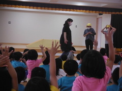幼児組はホールで5月うまれのお誕生日会をしました。誕生児のおともだちに歌と冠のプレゼントをした後、新しくなった園庭の遊び方・おもちゃの片付け方についての話をしました。又、こんな時どうするの問いかけに「ちいさいおともだちがあそびゆうときはきをつけちゃらないかんがで」など子どもたちからの可愛い返答もありましたよ。