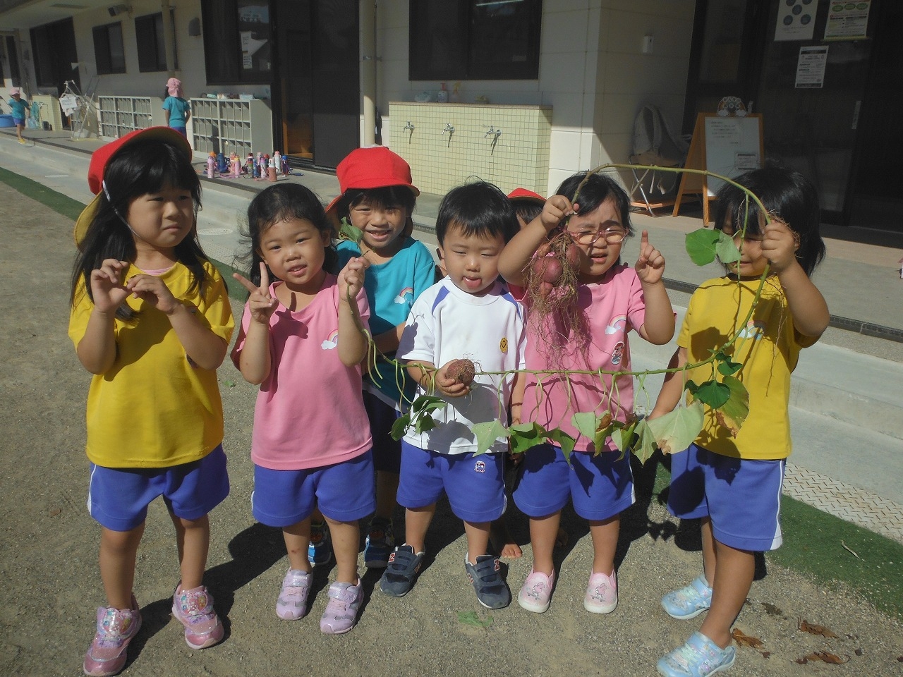 保護者の皆さまへ にじいろブログ お芋がとれたよ 2022.10.24 3歳児クラスのお芋ほり!!プランターで育てた小さなかわいいお芋畑♪子ども達の両手の平くらいの美味しそうなお芋がとれました!やったね(^^)v . ブログ一覧へ戻る